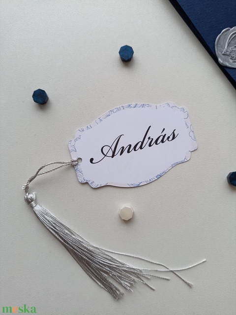 Esküvői ültetőkártya vintage kék virágos forma vágott