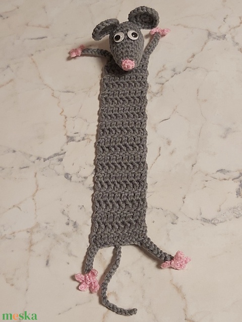 Kézzel horgolt szürke színű kisegér könyvjelző akril fonalból készítve. A szemek műanyagból készültek, varrással kerültek rögzítésre.