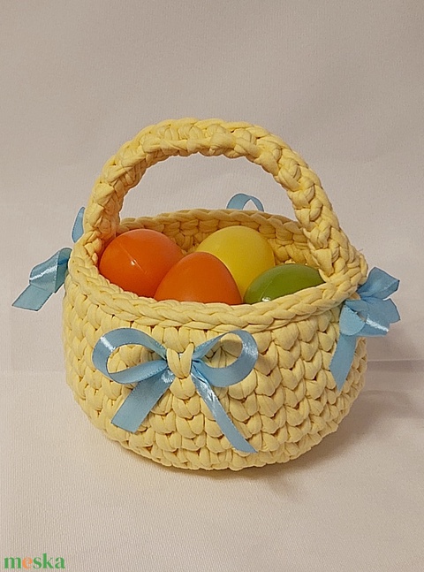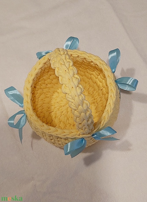 Kézzel horgolt sárga színű kosárka pólófonalból készítve, világoskék szalagból készült masnikkal díszítve. A műanyag tojások dekorációs célt szolgálnak, nem képezik a termék részét.