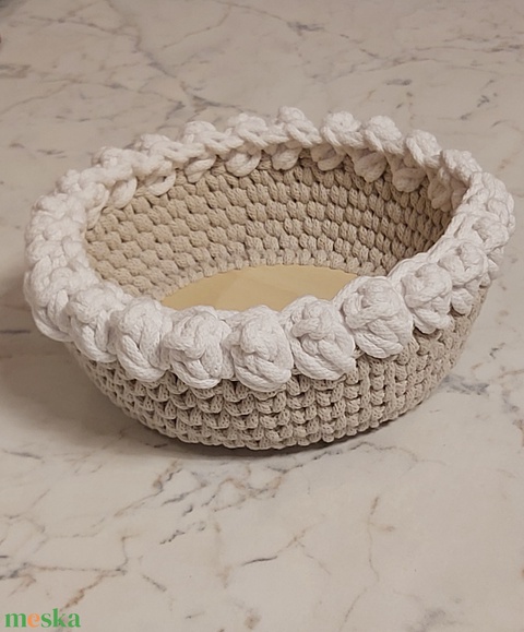Kézzel horgolt len színű kosárka zsinórfonalból készítve, fehér horgolt tulipánokkal díszítve. A műanyag tojások dekorációs célt szolgálnak, nem képezik a termék részét.