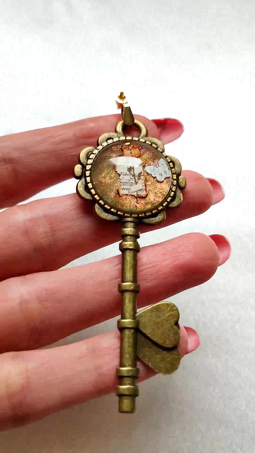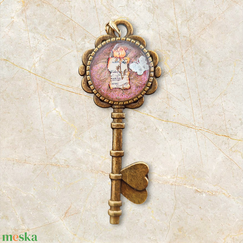 Vintage stílusú üveglencsés medál kulcs alakú romantikus szívekkel