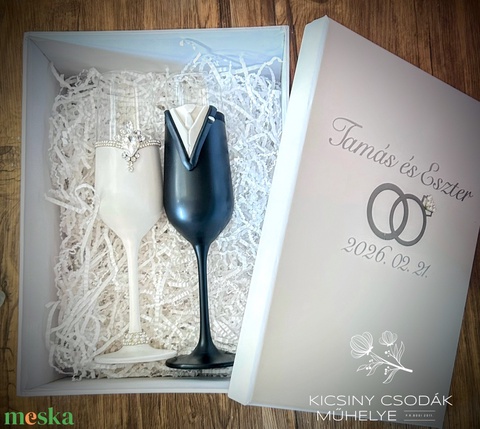 Egyedi menyasszony–vőlegény pezsgőspohár szett díszdobozban,Esküvői ajándék