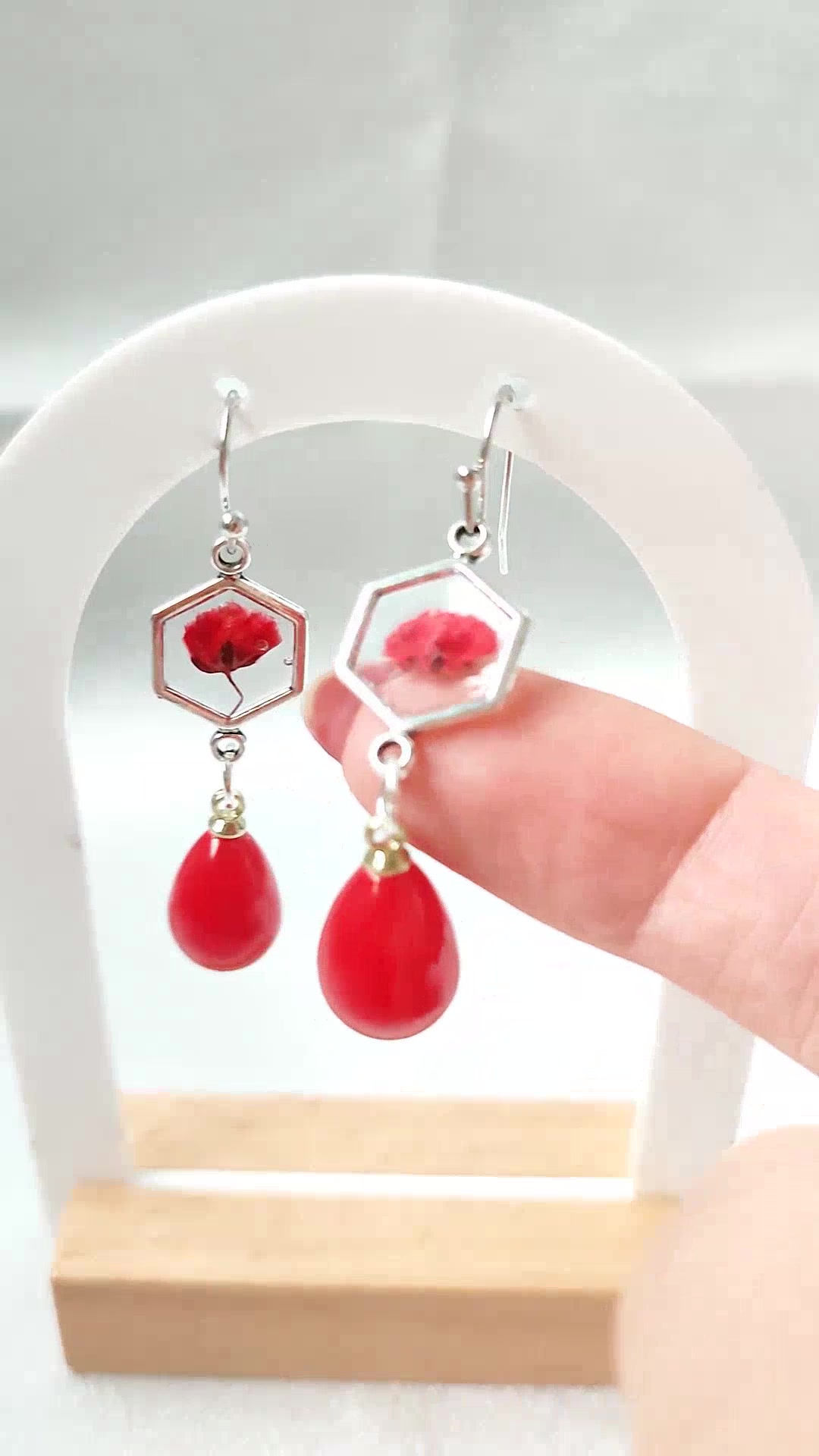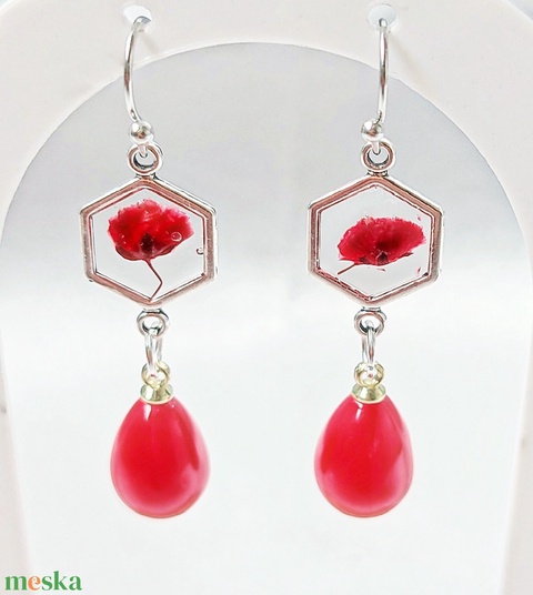 Elegáns apró lógó fülbevaló valódi préselt virágokkal piros gyöngyökkel