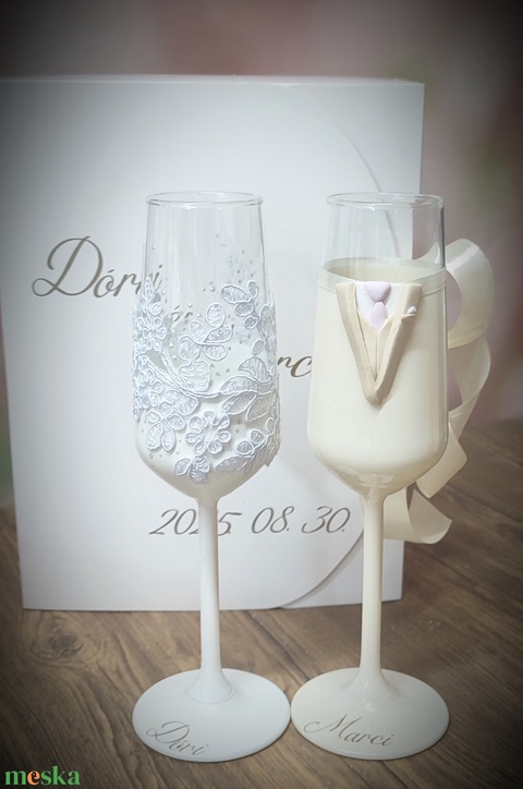 Egyedi menyasszony–vőlegény pezsgőspohár szett díszdobozban,Esküvői ajándék