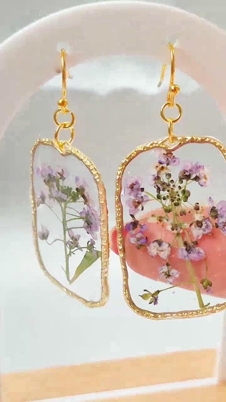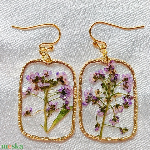 Elegáns szögletes fülbevaló valódi préselt lila virágokkal