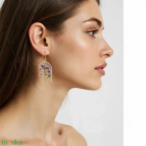Bohém Elegancia - Arany keretes műgyanta fülbevaló valódi lila virágokkal