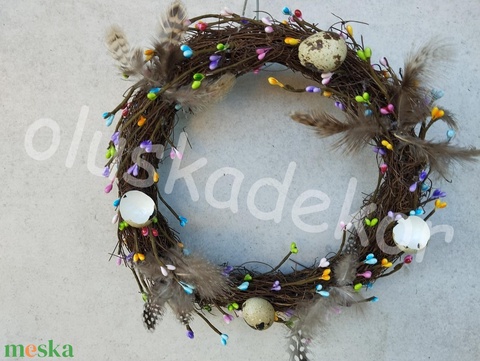 Húsvéti színesbogyós, igazi fürtojással díszitett ajtódísz, kopogtató, dekoráció, kb.27cm