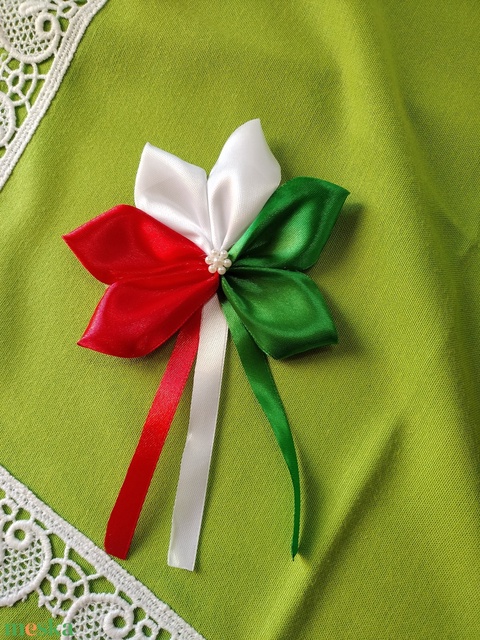 Szatén szalagból készített kokárda, melynek mérete kb 15 cm