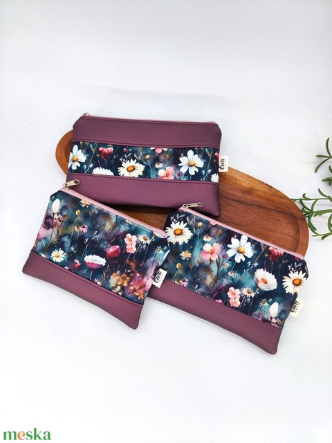 Mini cipzáros tároló Lila/ padlizsán szín- Középen virágos minta, Virágos minta szélesebb, Virágos minta kisebb