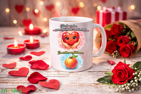 A bögre mintáján egy kedves, mosolygó szív figura és egy játékos barack illusztráció jelenik meg, a humoros és szeretetteljes felirattal: