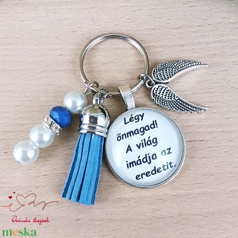 „Légy önmagad!” motivációs üveglencsés kulcstartó kék bojttal – inspiráló ajándék nőknek