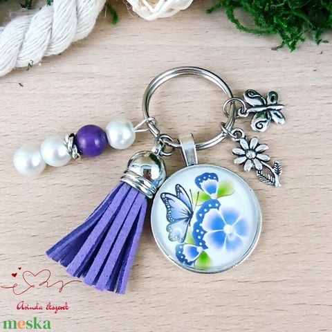 Pillangós virágmintás üveglencsés kulcstartó lila bojttal – romantikus ajándék nőknek