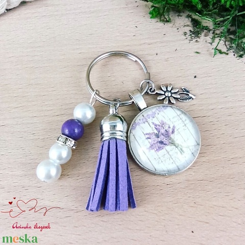 Levendulás üveglencsés kulcstartó lila bojttal – romantikus ajándék nőknek