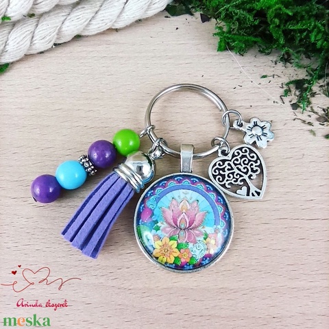 Lótusz virágos üveglencsés kulcstartó lila bojttal – spirituális ajándék nőknek