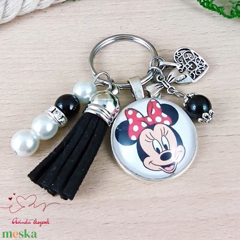 Minnie mintás üveglencsés kulcstartó fekete bojttal – cuki ajándék lányoknak
