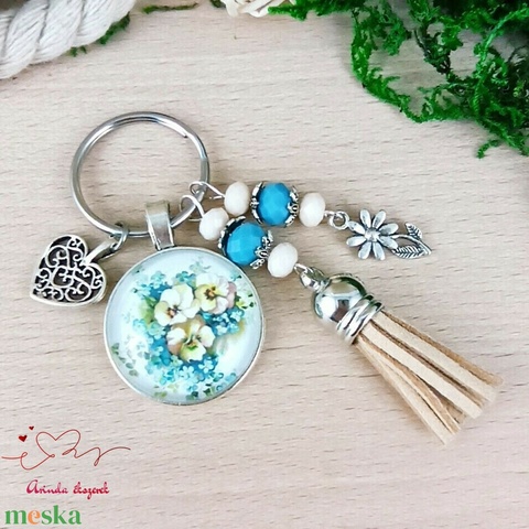 Nefelejcs virágmintás üveglencsés kulcstartó bézs bojttal – szívhez szóló ajándék nőknek