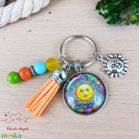 Színes nap motívumos üveglencsés kulcstartó narancs bojttal – bohém ajándék nőknek