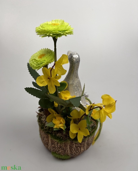 Polly Kacsa - tartós tavaszváró asztaldísz százszorszéppel, s növényi részekkel a mohás kaspó kollekcióból (P-14)