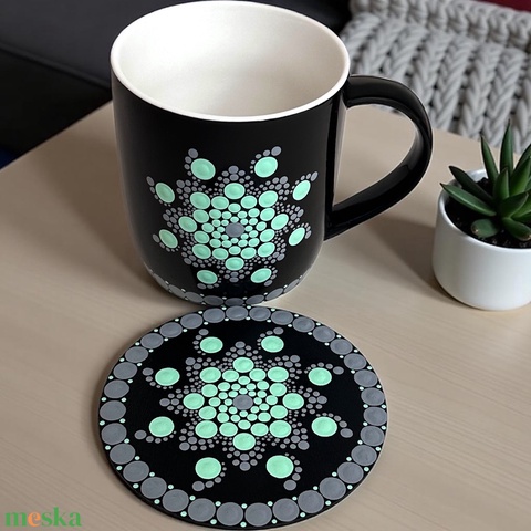 3,3 decis kerámia bögre és fa poháralátét szett zöld és szürke színekkel festett pontmandalával - rendelhető