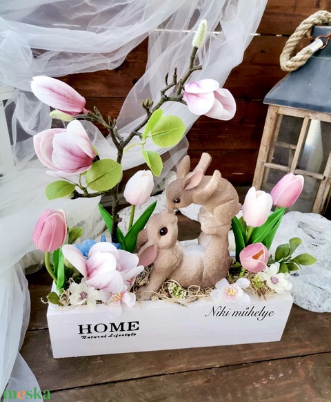 Magnólia tulipán dekoráció, Tavaszi asztaldísz, húsvéti láda dekoráció, dekor