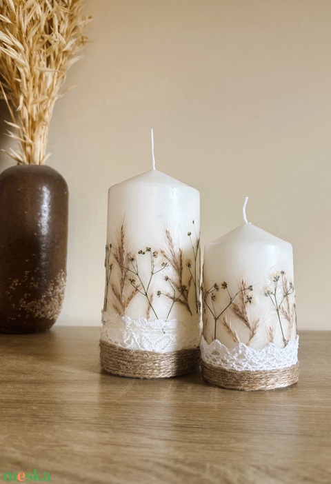 - Anyag/Összetevő klasszikus viaszgyertya, szárazvirág díszítés, bélelt díszdoboz, díszítő szalag