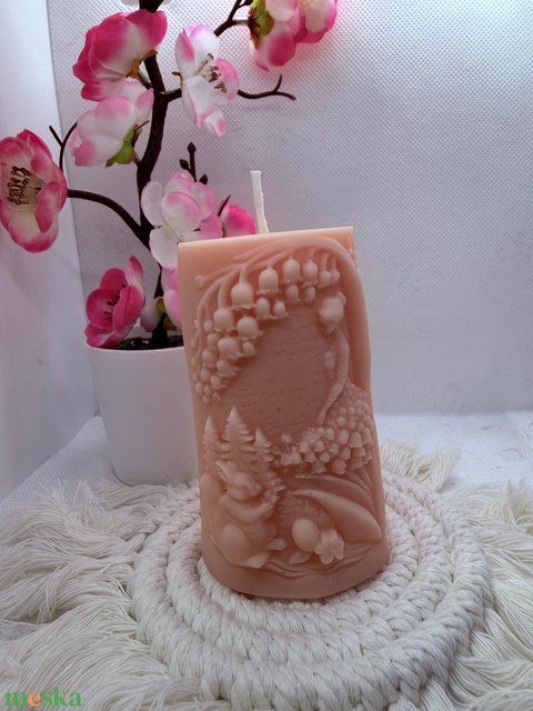 Barack színű, gyöngyvirág mintás kézműves tömb gyertya