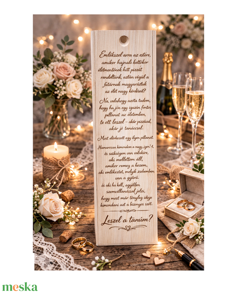 Egy igazán különleges kérdés megérdemli a hozzá illő ajándékot. Ez az elegáns, natúr fa borosdoboz nemcsak egy stílusos csomagolás, hanem egy maradandó emlék is, amely megható és humoros módon teszi fel a nagy kérdést: Leszel a tanúm?