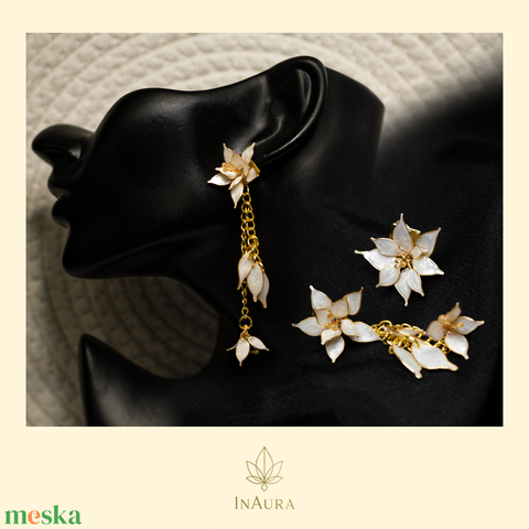 Selyemfehér, aranyszínű keretes asszimetrikus virág lógós fülbevaló