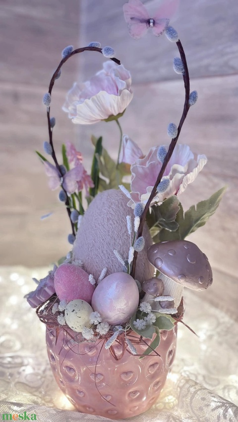 - Anyag/Összetevő kerámia kaspó, oázis, művirágok, barka, pillangó, kerámia gomba, virág, hungarocell tojás, levél