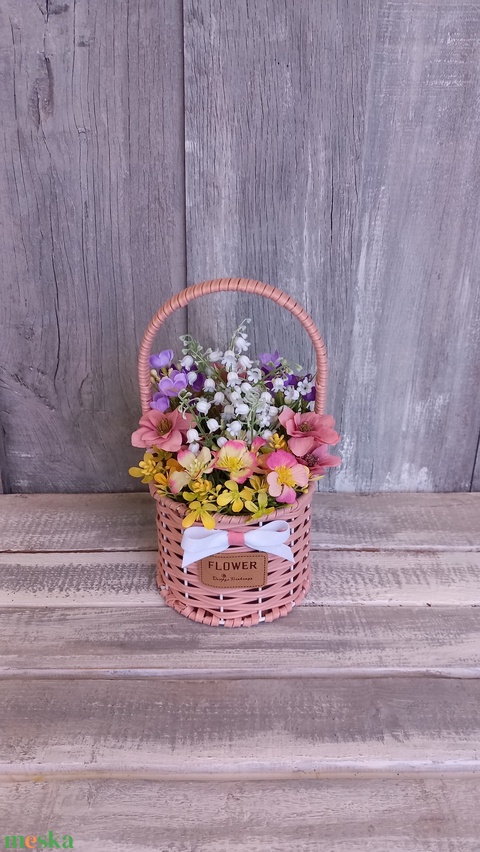 - Anyag/Összetevő művirágok, selyemvirágok, kosár, szalag, tűzőhab, masni