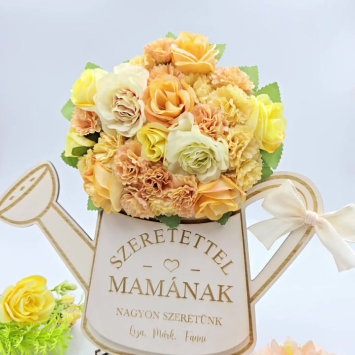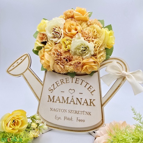 Ajándék anyák napjára - selyemvirágokkal díszített egyedi feliratos öntözőkanna