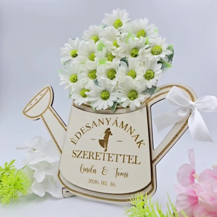 Szülőköszöntő ajándék - selyemvirágokkal díszített egyedi feliratos öntözőkanna 14.