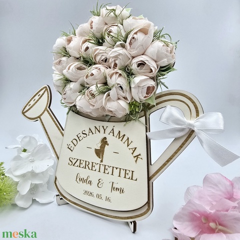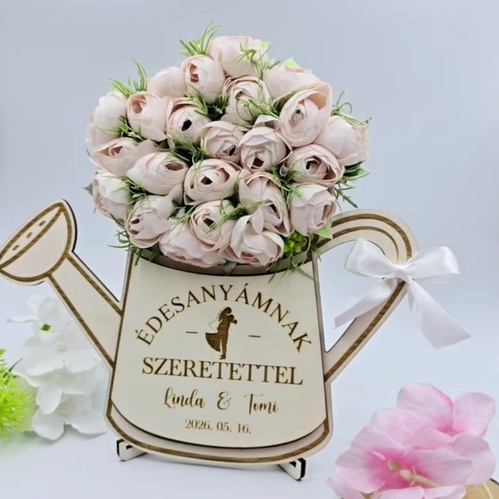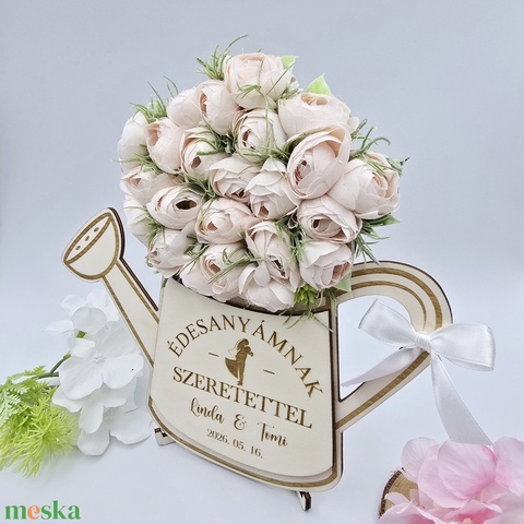 Szülőköszöntő ajándék - selyemvirágokkal díszített egyedi feliratos öntözőkanna 15.