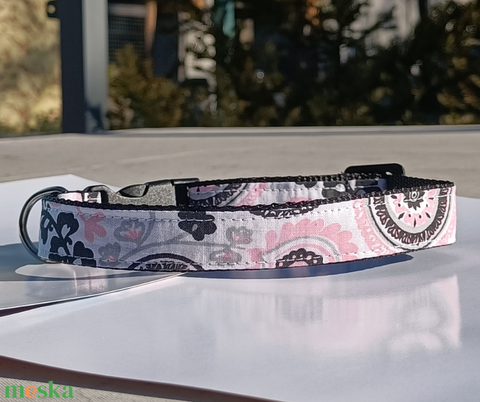 - Anyag/Összetevő erős heveder alap, mintás pamutvászon borítás, strapabíró műanyag csat, fém d-karika póráz rögzítéshez