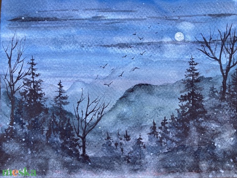 Eredeti akvarell - Telihold, éjszaka, fenyők, fák, madarak, misztikum