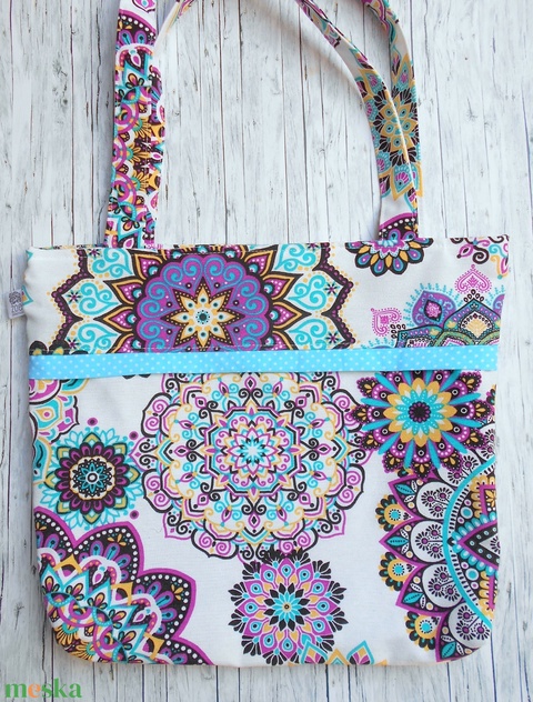 Fehér alapon pink-fekete-sárga-türkizkék mandala mintás válltáska