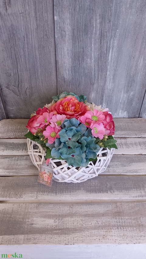 - Anyag/Összetevő művirágok, selyemvirágok, tűzőhab, kártya, fonottvirágtartó