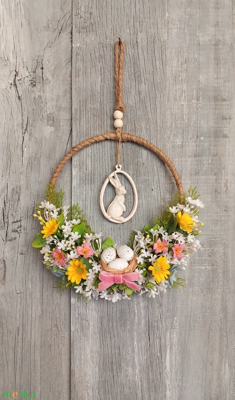 - Anyag/Összetevő művirágok, műzöldek, szalag, nyuszidekor, selyemvirágok, jutakarika, dekortojásfészek