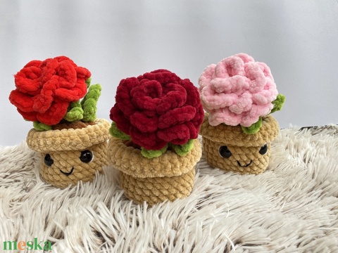 Kézzel horgolt rózsa mosolygós kaspóban, cserepes rózsa