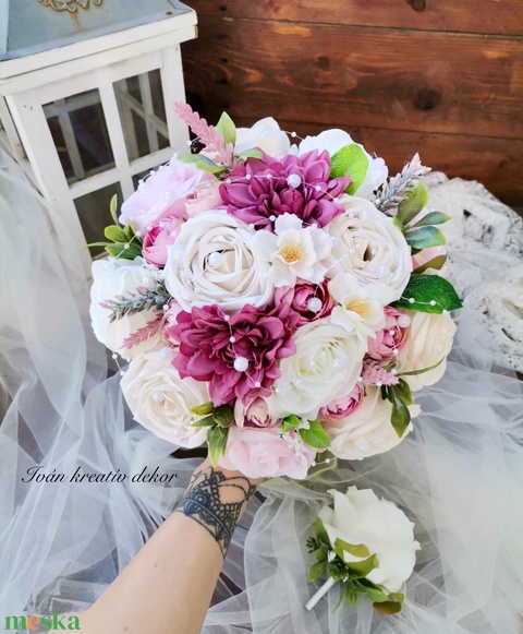 Gyöngyös Menyasszonyi csokor, örökcsokor, selyemvirág csokor kitűzővel, pasztell, nude csokor