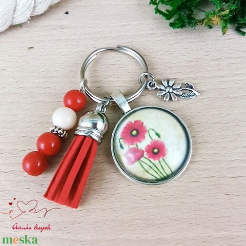 Pipacs mintás üveglencsés kulcstartó piros bojttal – ajándék anyukáknak és pedagógusoknak