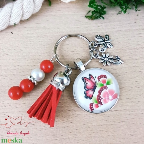 Pillangós virágmintás üveglencsés kulcstartó piros bojttal – nőies ajándék