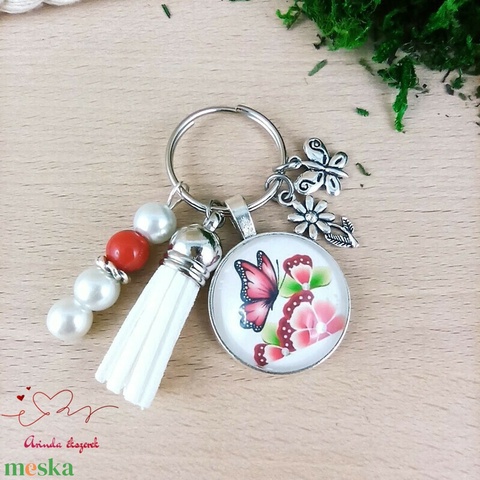 Pillangós virágmintás üveglencsés kulcstartó fehér bojttal – nőies ajándék