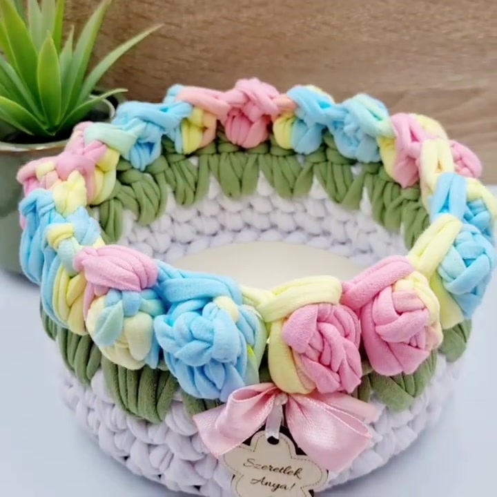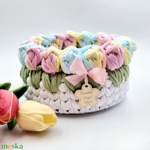 Horgolt tulipános tárolókosár egyedi felirattal, szivárványos szín. Ajándék óvó néninek