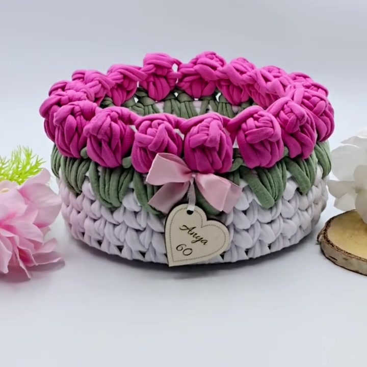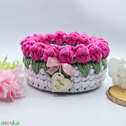 Horgolt tulipános tárolókosár egyedi felirattal, pink. Ajándék pedagógusnapra