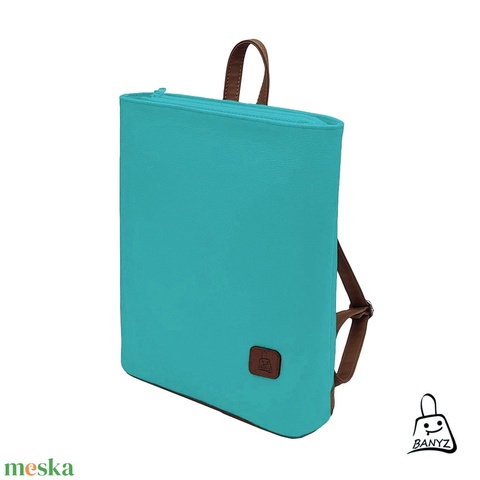 Ez a női hátitáska prémium minőségű türkiz és barna műbőrből készült, textil béléssel, rugalmas merevítéssel.