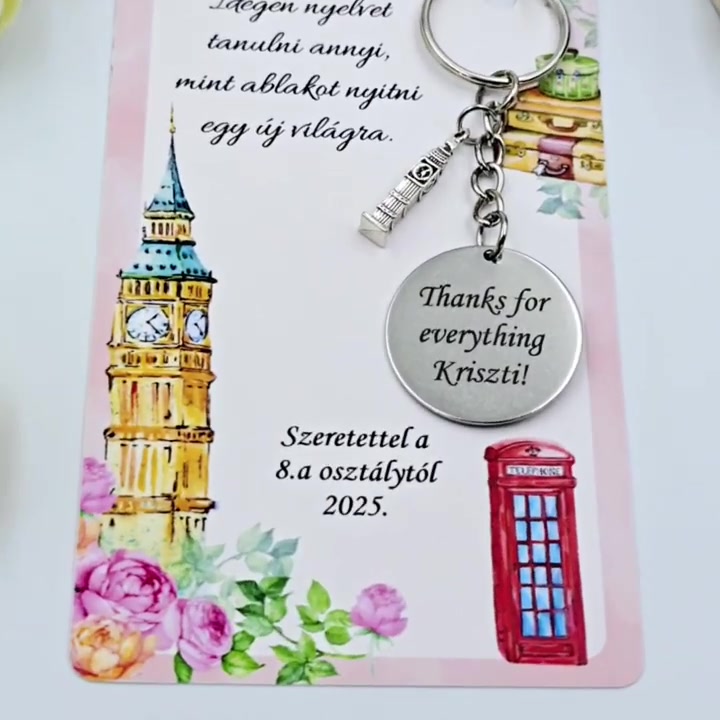 Angol tanároknak ajándék ballagásra, pedagógusnapra, tanév végére - Gravírozott ballagási kulcstartó ajándékkártyán