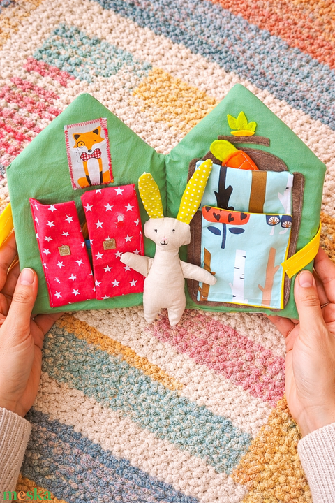 Interaktív textil házikó nyuszival - Nyuszi háza kiegészítőkkel - Nyuszis babaház öltöztethető nyuszival, tartozékokkal