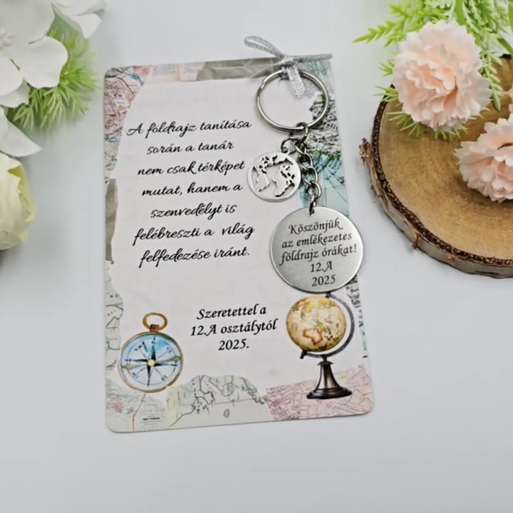 Földrajz tanároknak ajándék ballagásra, pedagógusnapra, tanév végére - Gravírozott ballagási kulcstartó ajándékkártyán