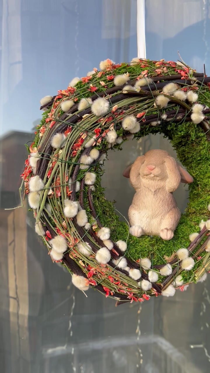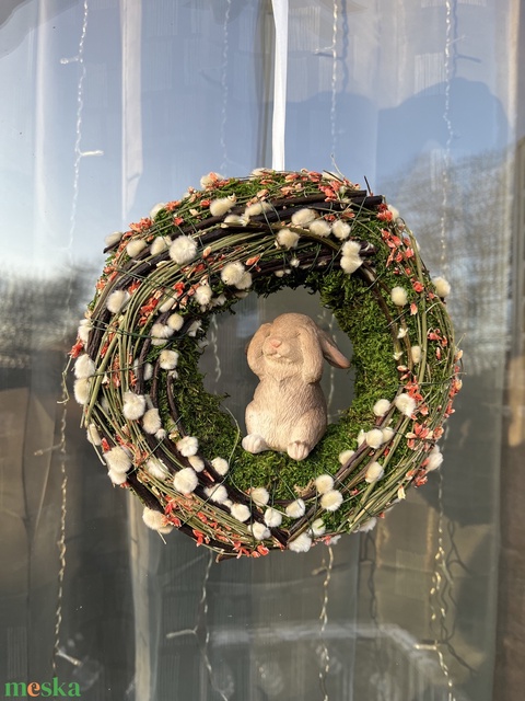 Természetes hangulatú, mohaalapra készült tavaszi ajtókopogtató, amelyet barkák és apró virágok díszítenek. A koszorú közepén egy bájos kis nyuszi ül, kedves és játékos húsvéti hangulatot teremtve.